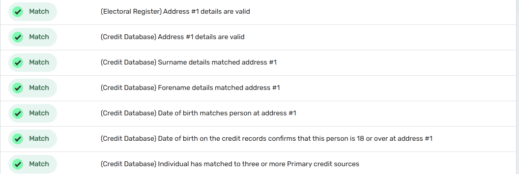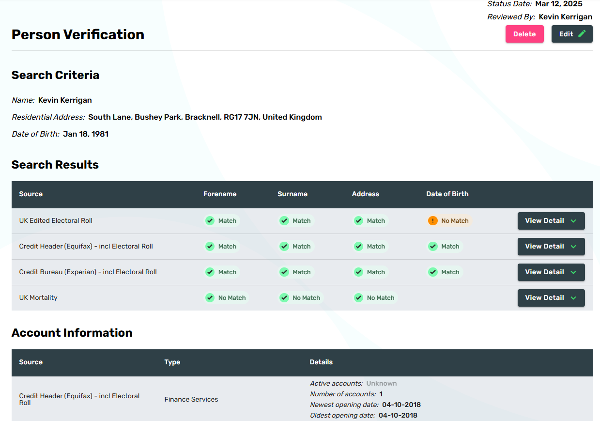 With this new feature, you now have the ability to verify client information (Name, Address, Date of Birth) against the electoral roll, credit bureaus and the UK mortality register. The below image provides an example of the summary results returned in a person verification search.
