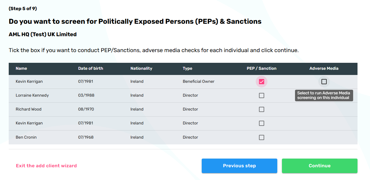 The screening service is provided as an optional add-on to your subscription. The current PEP/Sanction screening service costs £0.50 (0.1 Credits) for each individual. If you want to include the above datasets in a screening search, it will cost an additional £0.50 (0.1 Credits). You can decided to include the advanced datasets on a per individual basis. The service can be initiated from within the Client Onboard Wizard, from the Associated Parties table or from within the Client Details Page.