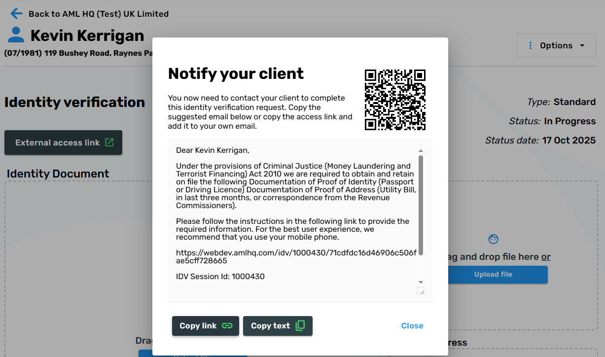 - We have added a QR code on the create ID Verification screen which will allow you to instantly access the ID Verification session. This is a handy feature if your client is present in your office and you want to help them complete the process on your device (this also works for the new Companies House process).